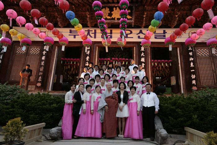 불기 2557년 부처님 오신 날 봉축법요식이 끝난 후 직지사보리수합창단원과 함께 한 흥선 주지스님.
