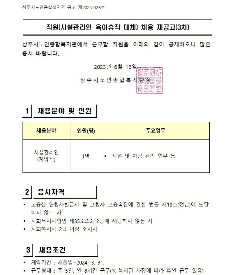 [직지사복지재단]상주시노인종합복지관 직원(시설관리인-육아휴직 대체) 채용 재공고(3차)
