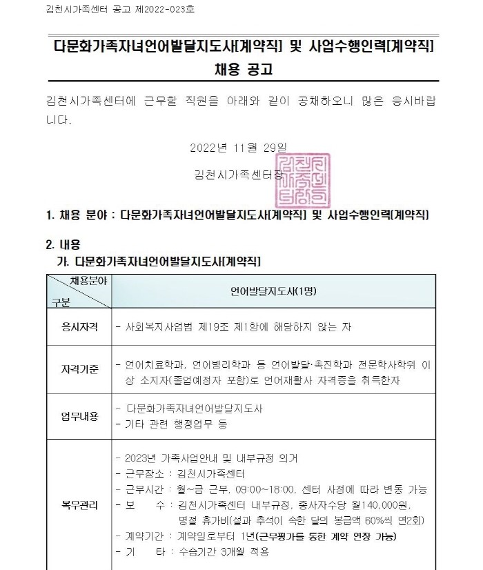 [직지사복지재단] 김천시가족센터 다문화가족자녀 언어발달지도사 및 사업수행인력 채용 공고
